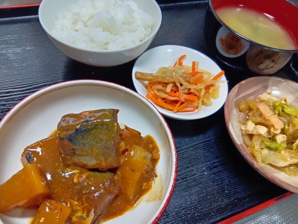 • さばと大根の味噌煮 厚揚げと白菜の和風炒め 大根のうま煮 味噌汁 ご飯