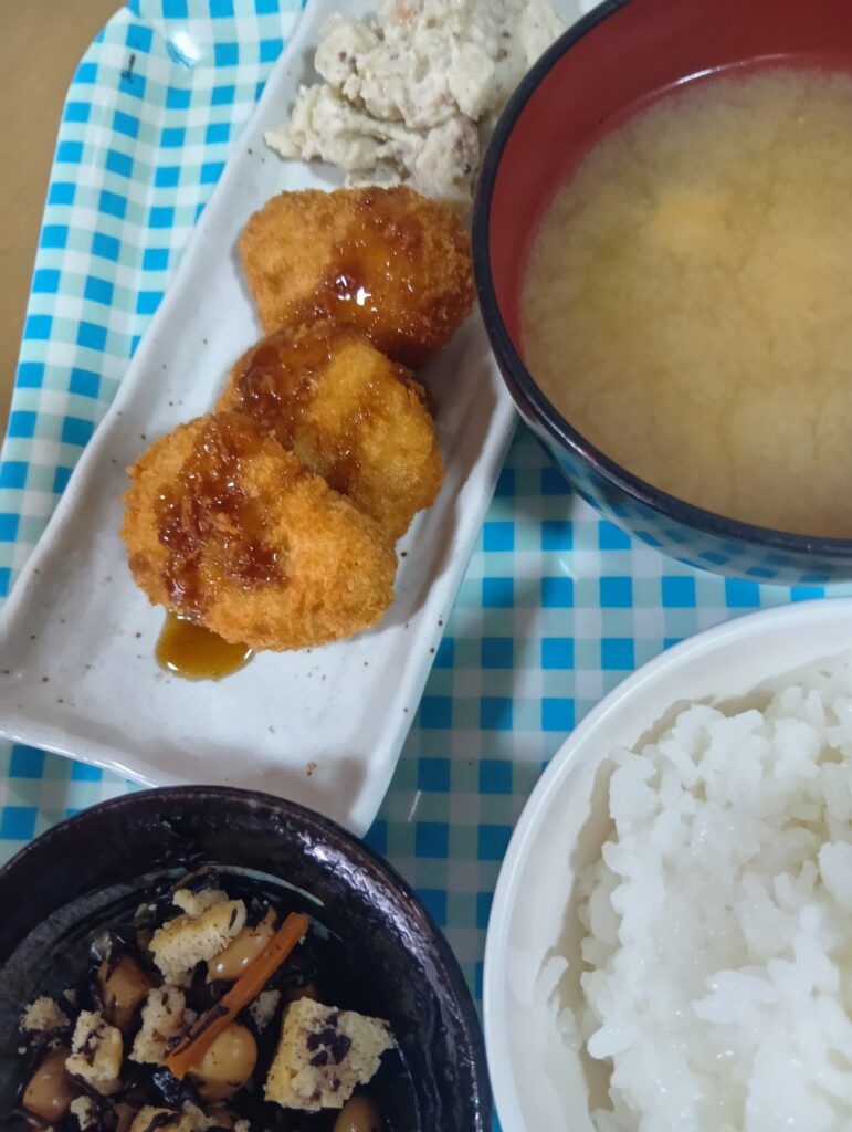 2025年12月23日 / 最終更新日時 : 2025年12月23日 momoi3choume3bell 今日のお昼ごはん ご飯 お味噌汁 チキンカツ ひじきの白和え ポテトサラダFacebookXBlueskyHatenaCopy