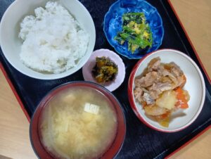 • ごはん 味噌汁 肉じゃが 漬け物 ほうれん草の玉子炒め