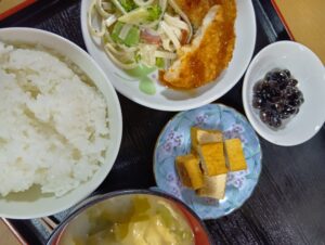 ご飯 お味噌汁 コロッケ うどんサラダ 厚揚げの煮物 黒豆