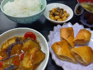 • 麻婆茄子 揚げ春巻き 大豆田舎煮 味噌汁 ごはん