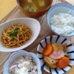 焼きパスタ、じゃがいも甘辛バター焼き、ちくわきゅうりサラダ、玉子スープ