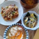 • 茄子と厚揚げ中華炒め、オクラえのきおかか和え物、ほうれん草玉子ソテー、味噌汁、ご飯