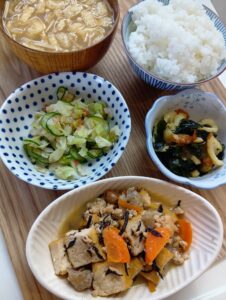 厚揚げ煮物、ワカメ竹輪炒め、きゅうり梅浅漬け、味噌汁、ご飯