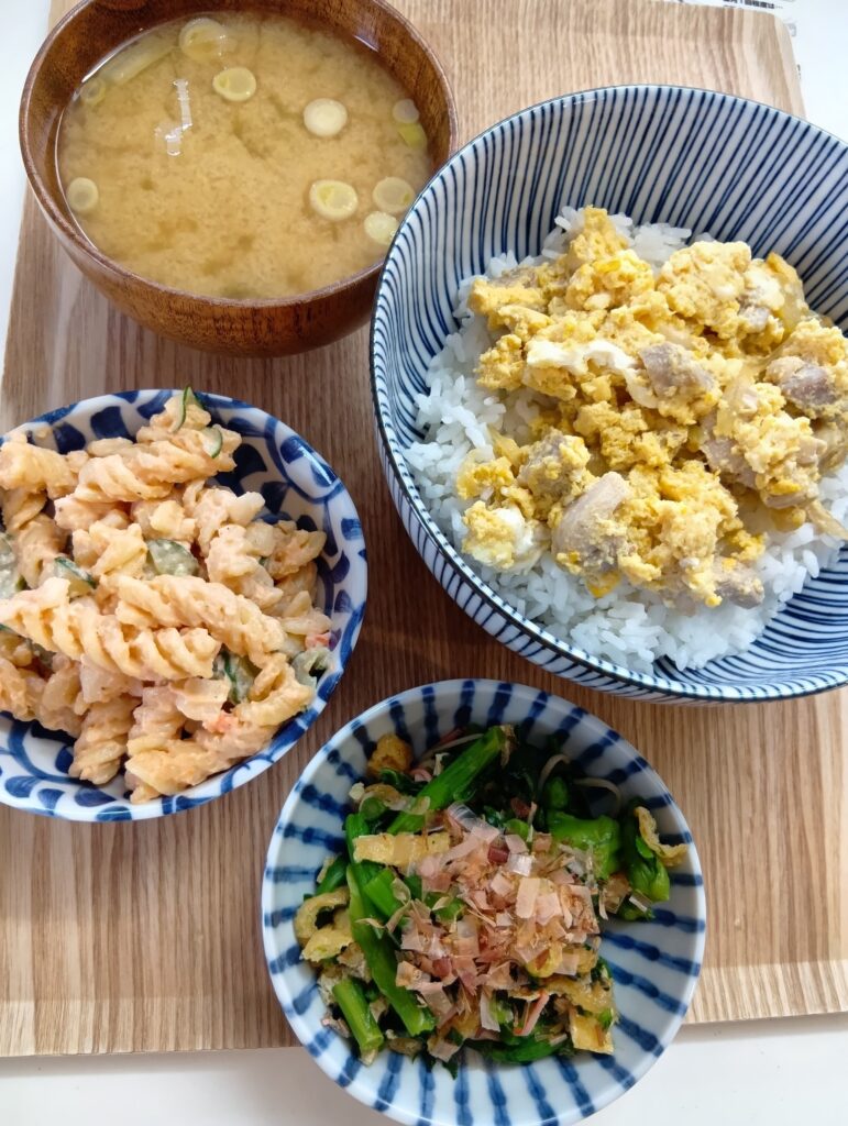 親子丼、マカロニサラダ、菜の花ポン酢和え物、味噌汁