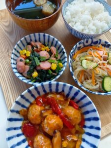 甘酢肉団子、ほうれん草ウインナー炒め、春雨サラダ、お吸物、ご飯
