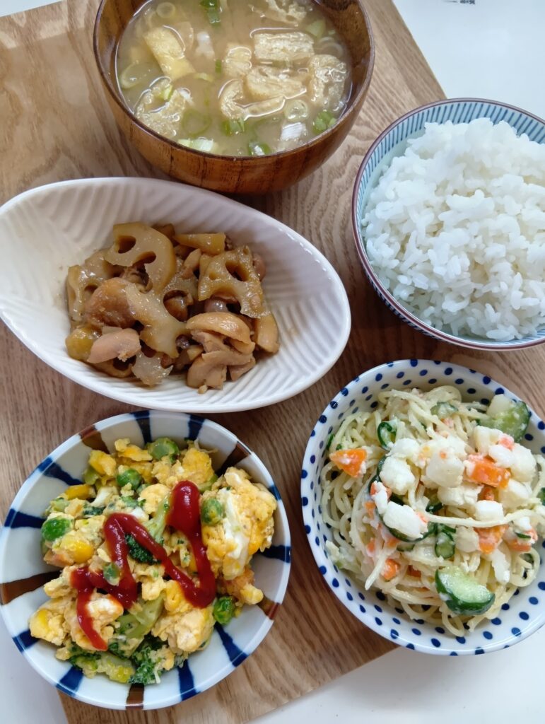 鶏肉れんこんテリヤキ、玉子ソテー、スパゲティサラダ、味噌汁、ご飯
