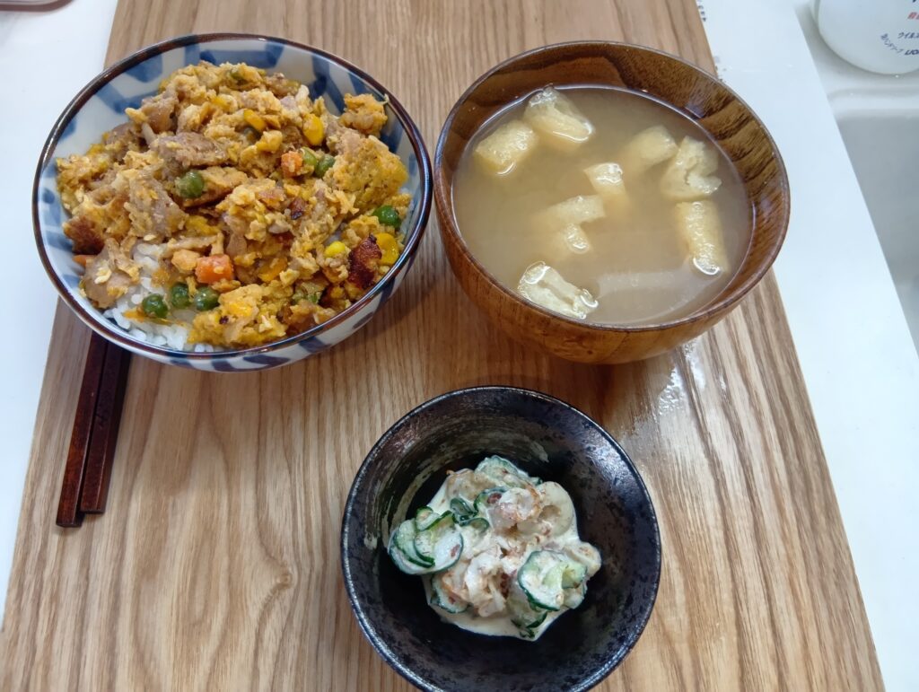スタミナ玉子丼、キュウリ竹輪サラダ、エノキ油揚げ味噌汁