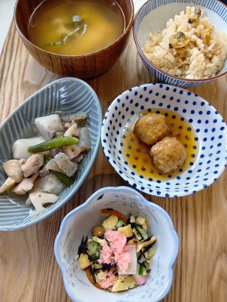 煮物、かまぼこひじき和え物、肉団子甘煮、アサリご飯、味噌汁
