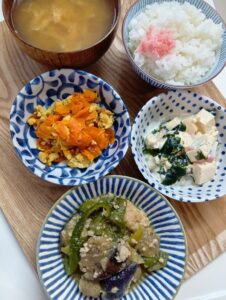 なす味噌炒め、人参シリシリ、豆腐サラダ、玉子スープ、ご飯