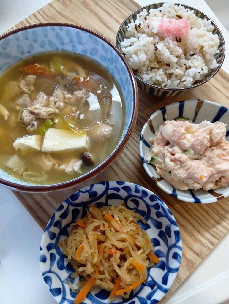 ちゃんこ鍋風汁、ポテトサラダ、切り干し大根、昆布ご飯