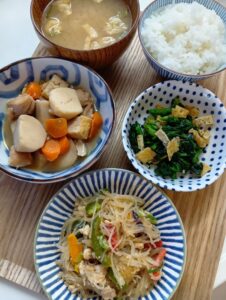 煮物、チャプチェ、菜の花胡麻和え、味噌汁、ご飯