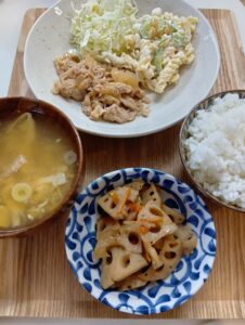 豚の生姜焼き、マカロニサラダ、れんこんきんぴら、ご飯、中華スープ