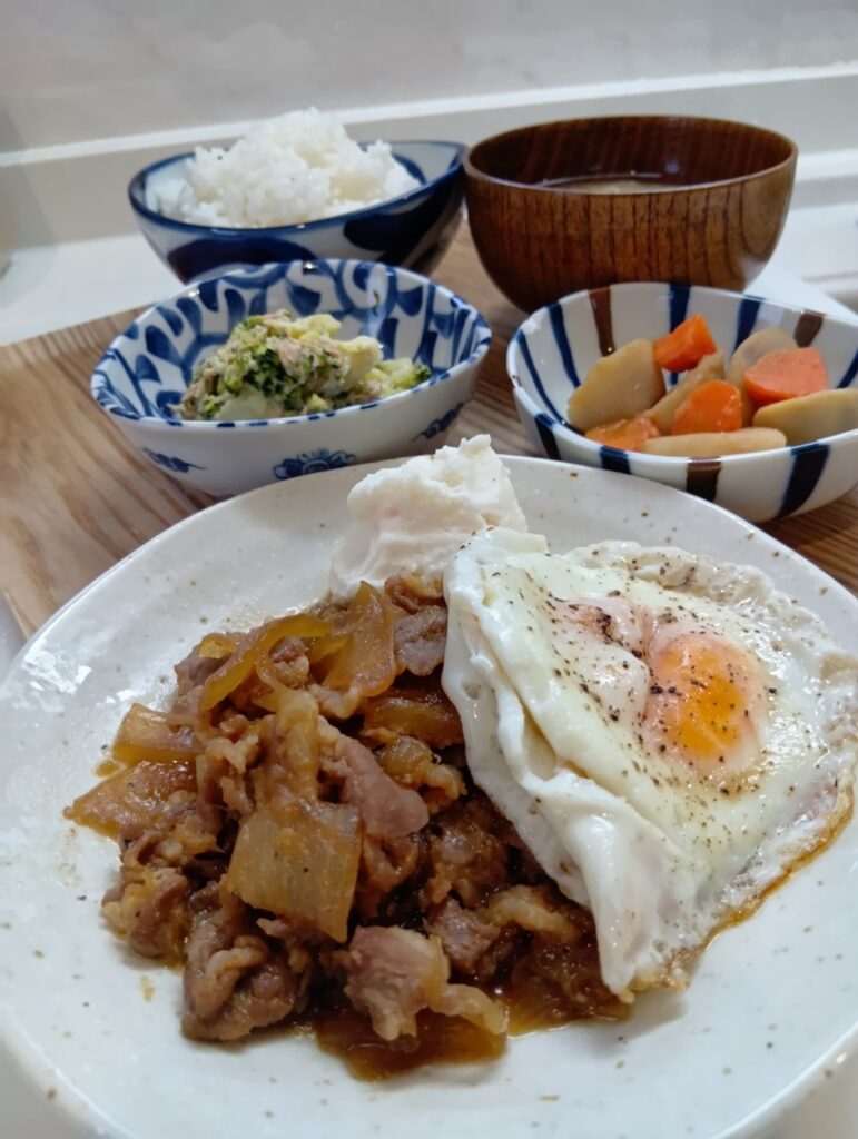 • 豚肉生姜焼き、里芋煮、ブロッコリーツナ和え物、白飯、青ネギ豆腐味噌汁