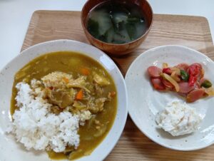 • カレーライス、ウインナーソテー、ポテトサラダ、味噌汁