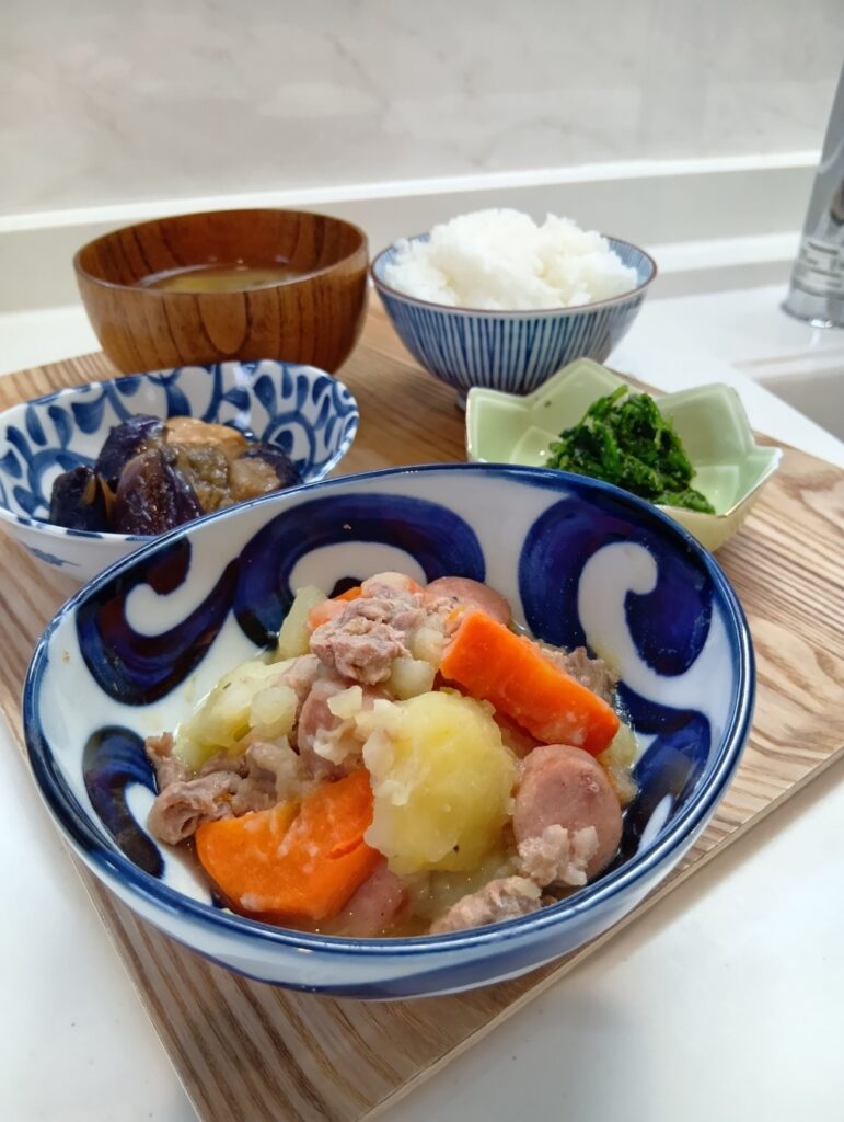 • じゃが芋煮物、茄子厚揚げ炒め、ほうれん草黒胡麻和え、白飯、もやし味噌汁