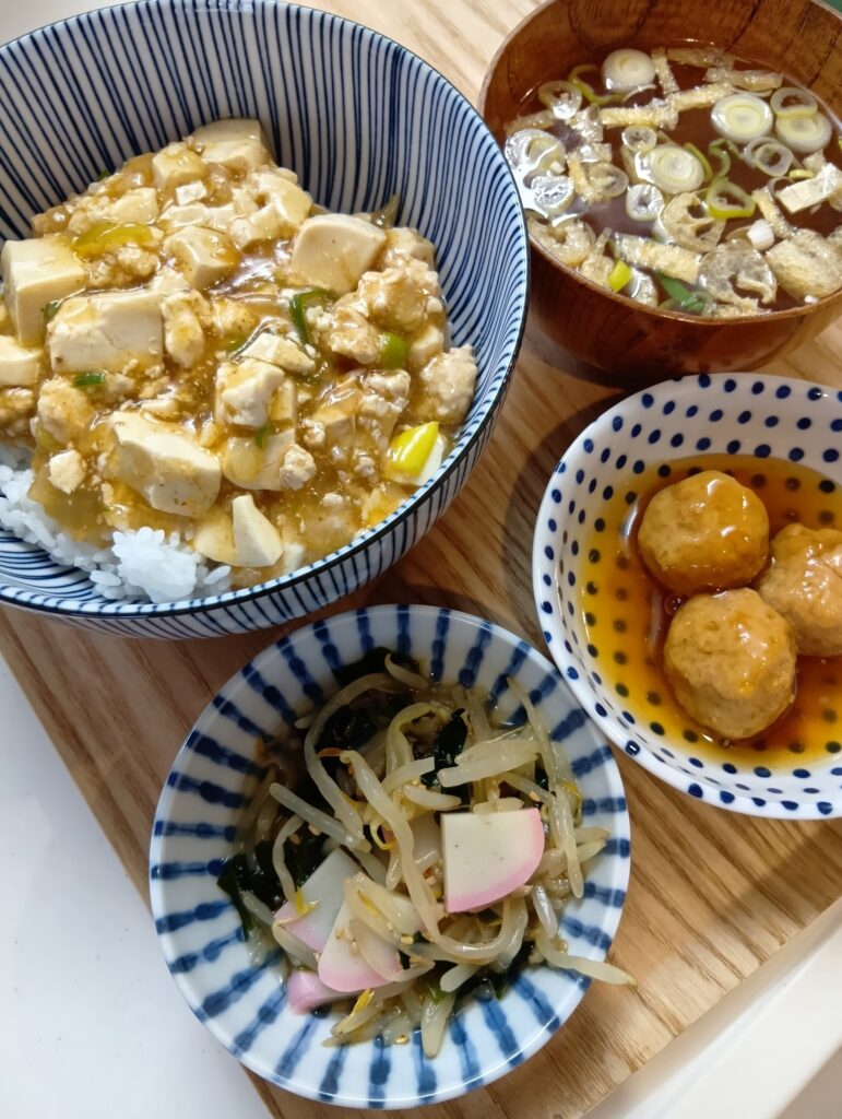 • 麻婆豆腐丼、肉団子甘辛煮、もやしナムル、お吸物、