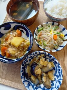 • 肉じゃが、なす味噌炒め、春雨サラダ、お吸物、ご飯