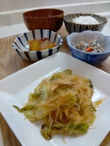 • キャベツと油揚げの炒め、大根と竹輪甘辛煮、玉葱とツナ黒胡麻サラダ、若芽エノキ味噌汁、白飯