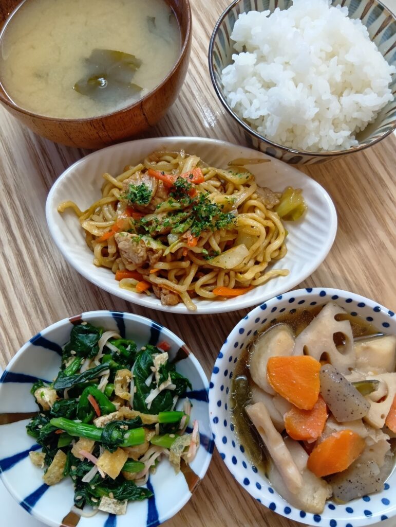 • 焼きそば、菜の花和え物、里芋煮物、味噌汁、ご飯