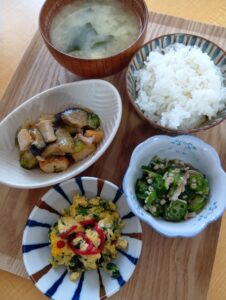 • 茄子と厚揚げ中華炒め、オクラえのきおかか和え物、ほうれん草玉子ソテー、味噌汁、ご飯
