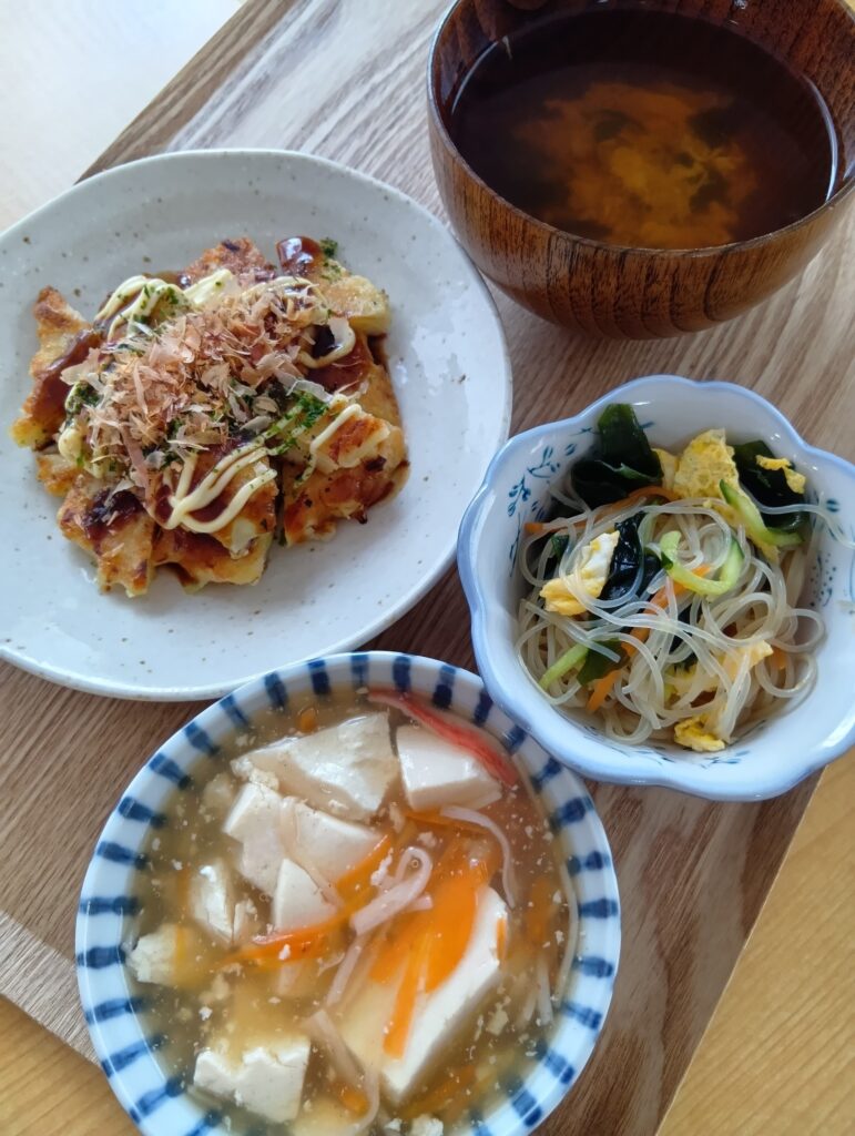 お好み焼き、豆腐トロトロ煮、春雨サラダ、お吸物