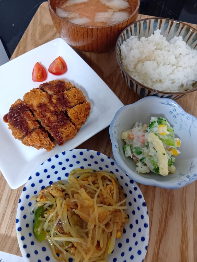 メンチカツ、カレービーフン、ブロッコリーマカロニサラダ、トマトスープ、ご飯