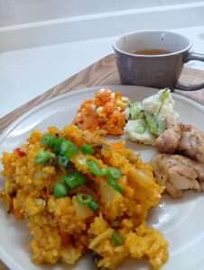 • パエリア風炊き込みご飯、ポテトサラダ、人参玉子おかか和え物、オニオンコンソメスープ、チキンソテー