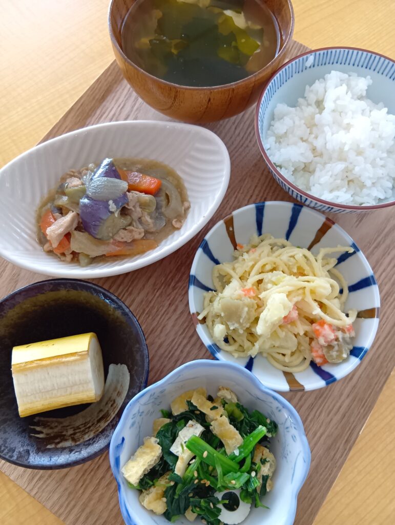 2026年3月12日 / 最終更新日時 : 2026年3月12日 shakujiikouen3bell 今日のお昼ごはん 茄子豚焼肉炒め、竹輪ほうれん草和え物、さつまいもスパゲティ、玉子わかめスープ、ご飯FacebookXBlueskyHatenaCopy
