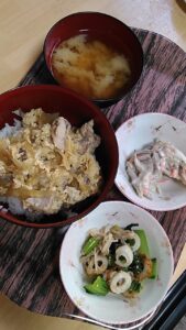 親子丼、チンゲン菜ちくわ和物、ごぼうサラダ、味噌汁