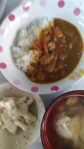 シーフードカレー、マカロニサラダ、コンソメスープ