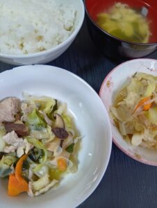 豚肉キャベツ炒め、春雨サラダ、玉子スープ