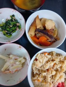 煮物、炊き込みご飯、ほうれん草和え物、マカロニサラダ、味噌汁