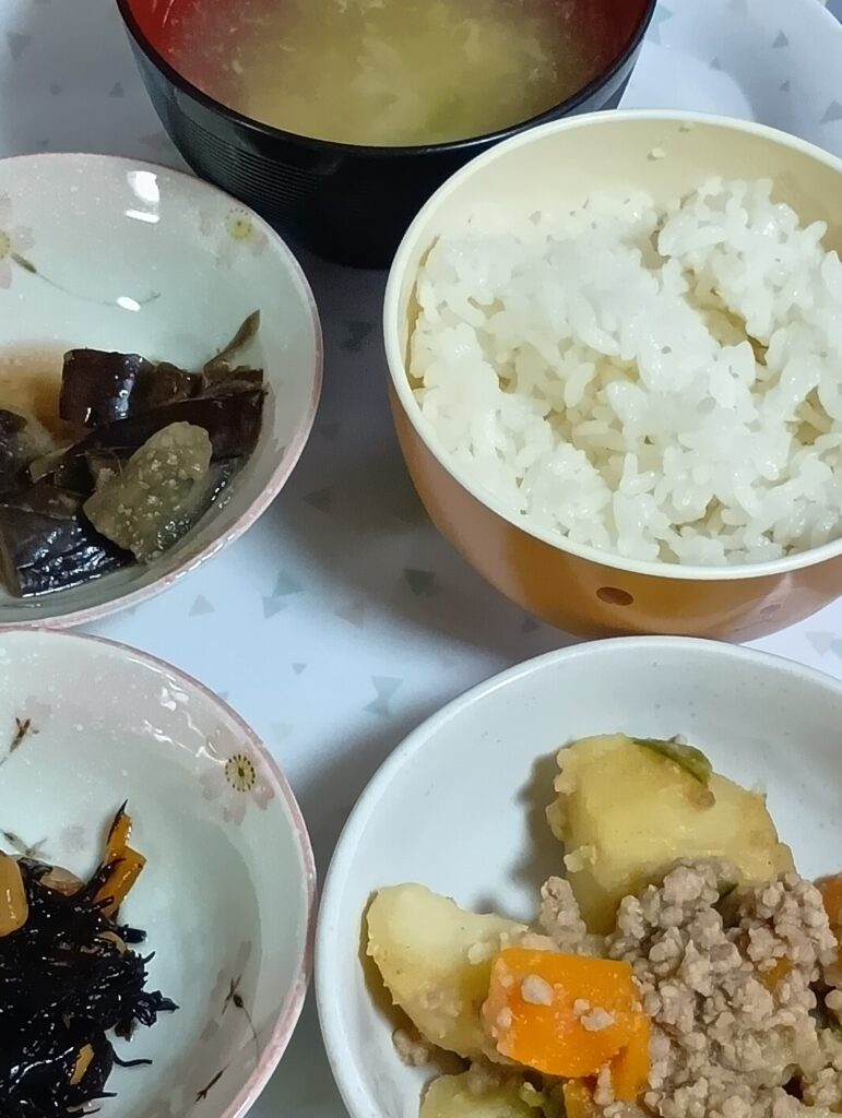 2025年10月20日 / 最終更新日時 : 2025年10月20日 tanashi3bell 今日のお昼ごはん じゃがいもそぼろ煮、茄子の煮浸し、ひじき煮、玉子スープFacebookXBlueskyHatenaCopy