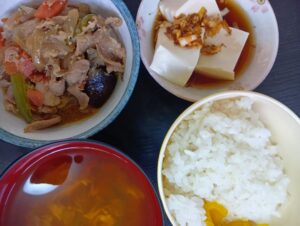 肉野菜の味噌炒め、湯豆腐、漬け物、きのこスープ