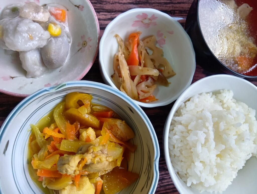 • 鶏と野菜炒め、ポテトサラダ、茄子と切り干し大根煮、みそ汁
