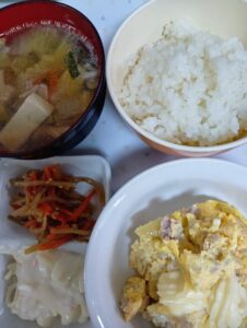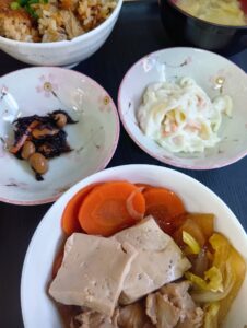 • 鶏と野菜炒め、ポテトサラダ、茄子と切り干し大根煮、みそ汁