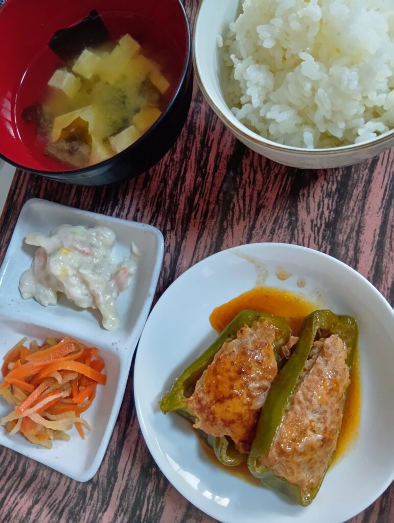 2026年1月9日 / 最終更新日時 : 2026年1月9日 tanashi3bell 今日のお昼ごはん ピーマンの肉詰め、ツナサラダ、切干大根煮、みそ汁FacebookXBlueskyHatenaCopy