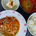 かぼちゃと鶏肉煮、キャベツの酢の物、ポテトサラダ、味噌汁