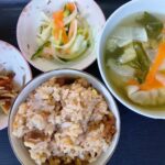 いわしの炊き込みご飯、野菜と餃子のスープ、マリネ、きんぴら