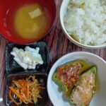 ピーマンの肉詰め、マカロニサラダ、切干大根煮、みそ汁