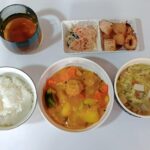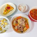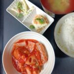 2025年9月24日 / 最終更新日時 : 2025年9月24日 honchomatsu3bell 今日のお昼ごはん日替わりランチ 豚キャベツ味噌煮込み さつまいもご飯 トマト野菜スープ スペインオムレツ マカロニサラダ