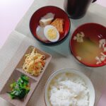 おでん パスタサラダ 小松菜甘酢和え ご飯 えのきの味噌汁