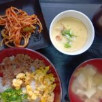 三色丼 茶碗蒸し スパゲッティサラダ 豆腐スープ ご飯