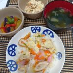• 鶏団子餡掛け丼、切り干し白和え、茄子煮浸し、ねぎスープ
