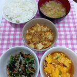 茄子マーボ炒め、菜の花ごま和え、サバ大根味噌煮、お味噌汁、ご飯