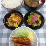 • チキンソテー、もやしナムル、ほうれん草カニカマ和え、ご飯豆腐お汁