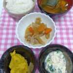 鶏唐揚げ、キャベツ千切り添え、ごま春雨サラダ、かぼちゃ煮付け、野菜スープ、ご飯