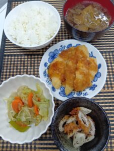 あじフライ、竹輪ゆかりソテー、野菜炒め、茄子お汁、ご飯