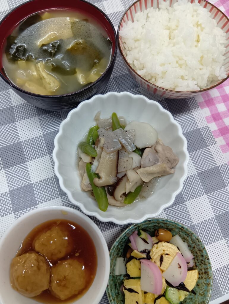 3. 煮物 肉団子煮 かまぼこひじき和物 みそ汁 ご飯